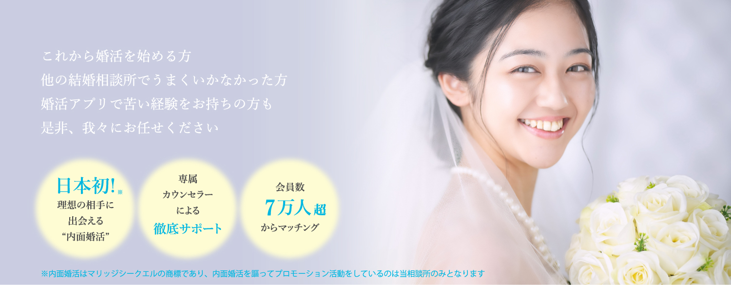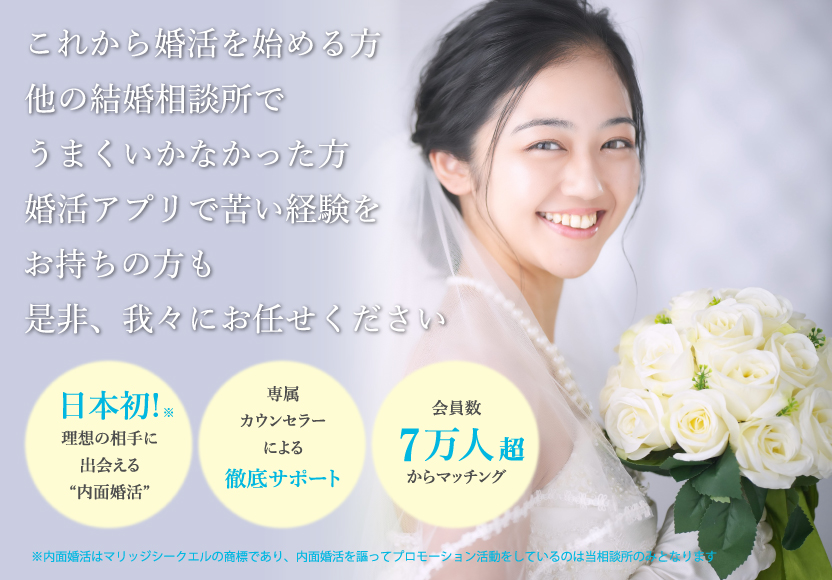 どの婚活サイトより、内面に焦点を当てて婚活をサポート!プロフィール作成と面談にこだわり、納得いく成婚はもちろん、結婚後も後悔しない理想の相手との出会いのお手伝いをいたします!
