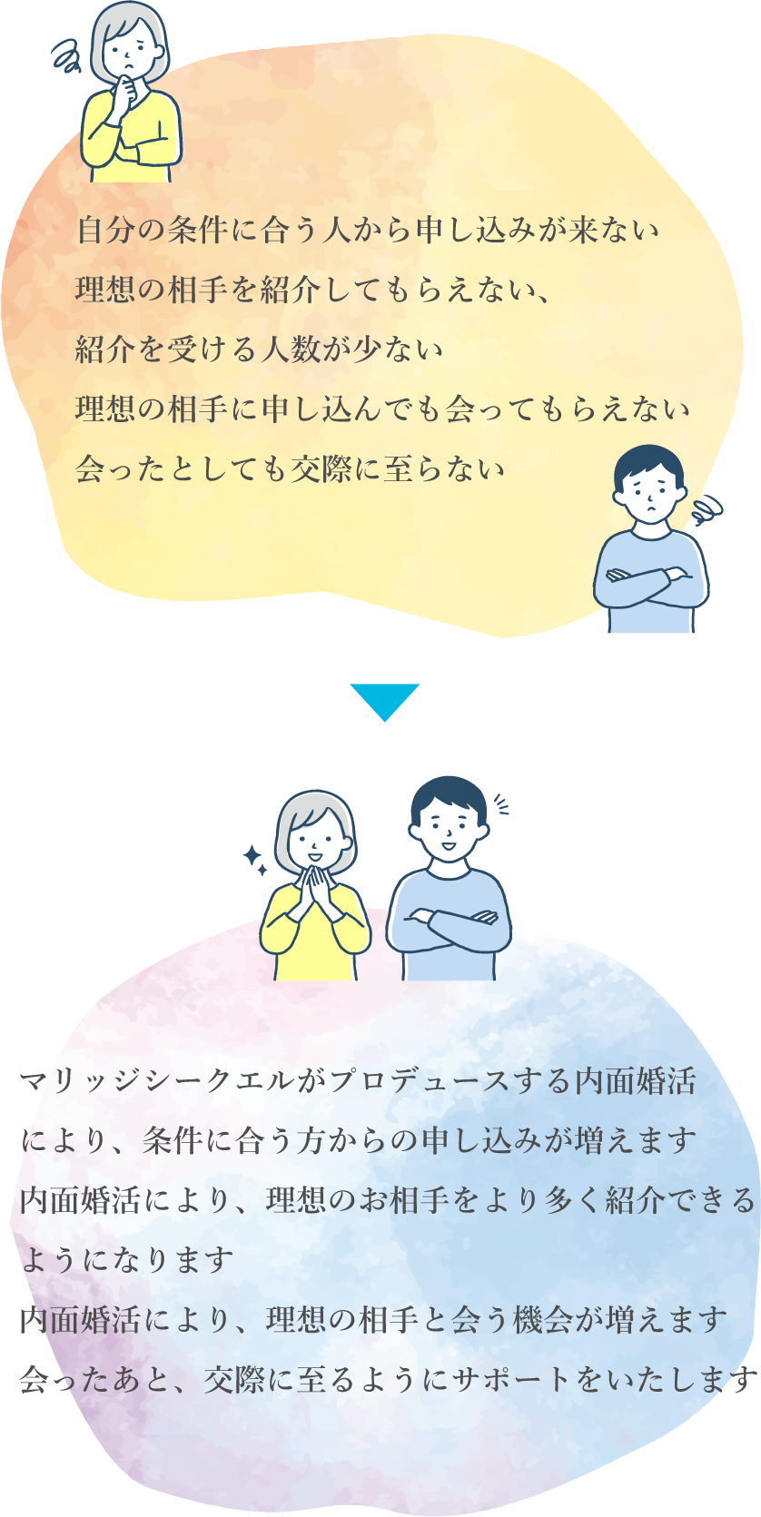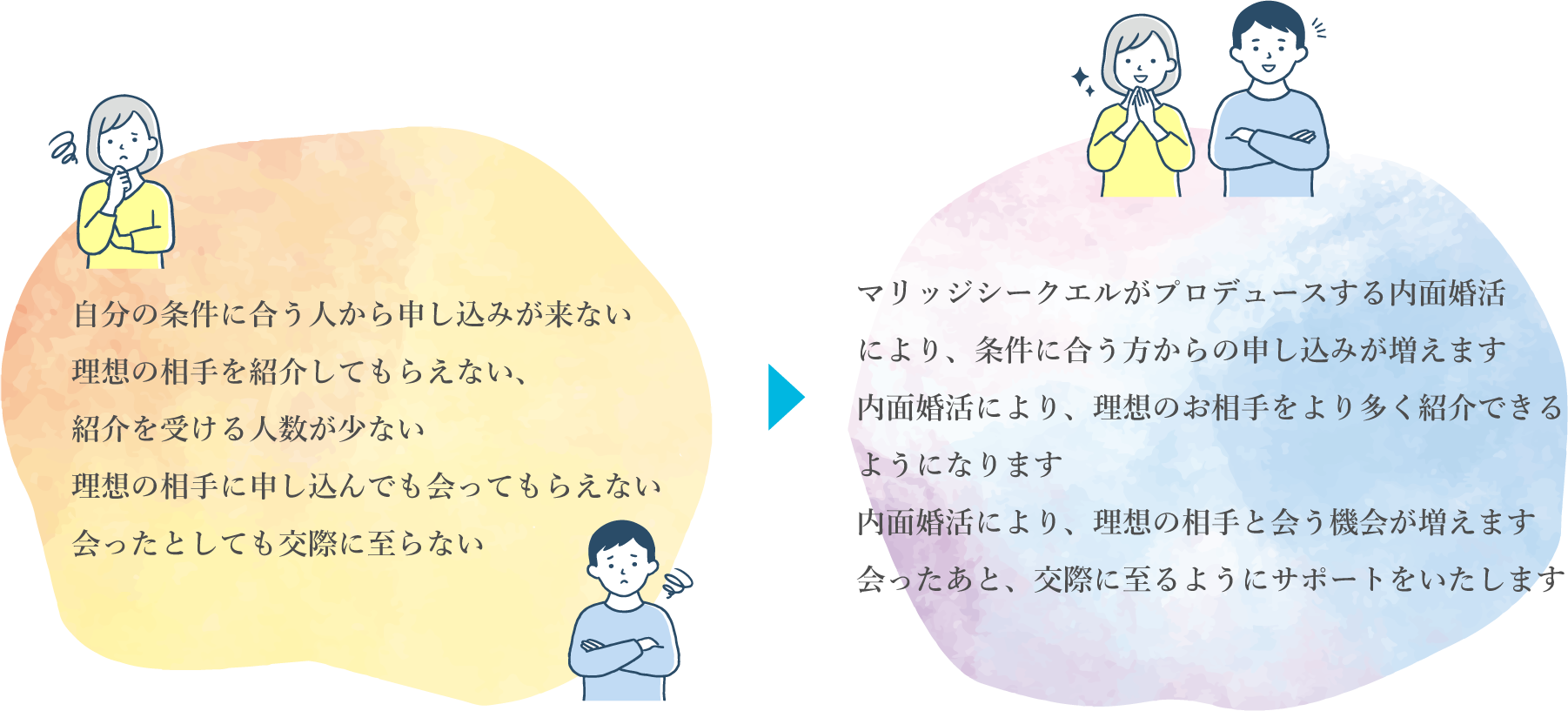 ほかの結婚相談所に入会したものの出会えなかった、カウンセリングが不十分だった、ほったらかしにされて前に進めなかった方 等々