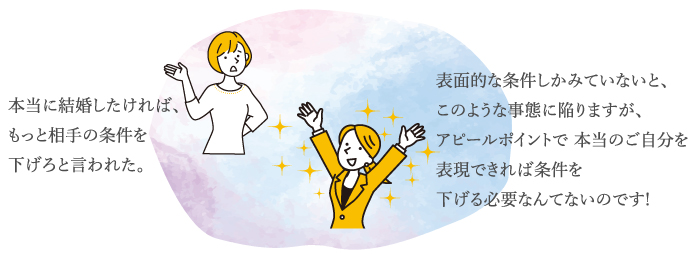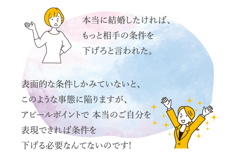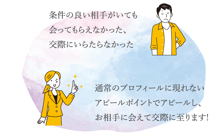 心当たりがある方も多いのではないでしょうか。 運営側は「ある程度の妥協は必要」というのを大前提に進めようとするのが一般的です。 たしかに100%理想の相手を探すのは難しいのかも知れませんが、 それを簡単なプロフィールの段階で判断されてしまうと、 婚活のフィールドに立つこともできません。この進め方では、 本当は釣り合いが取れた相手なのにお互いがお互いを知る機会が与えられないため、 プロフィールの段階でどちらかがオファーを断ってしまうというパターンが多発します。